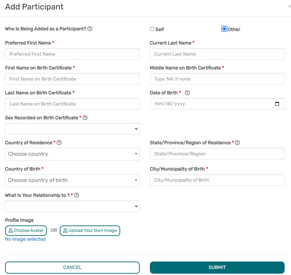 Step 2: If you are the Participant themself (i.e., the person with the disease), please enter your information Select Self for “Who is Being Added as a Participant?”.