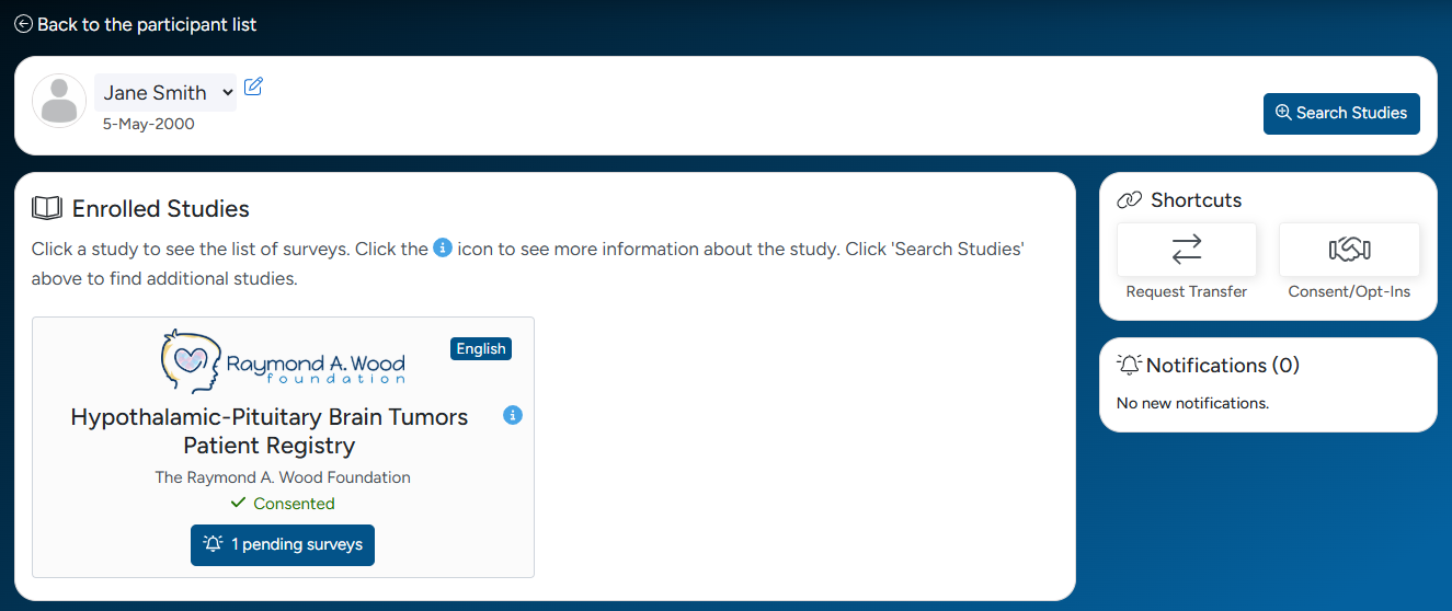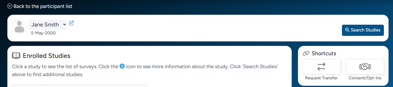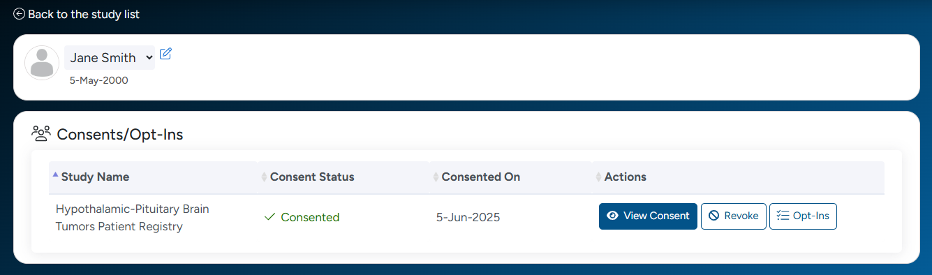 Step 1: Once you have consented to the study, you are able to view your consent at any time. Navigate to the Enrolled Studies page. Then, click “Consents/Opt-Ins” to see your consent and opt-ins.