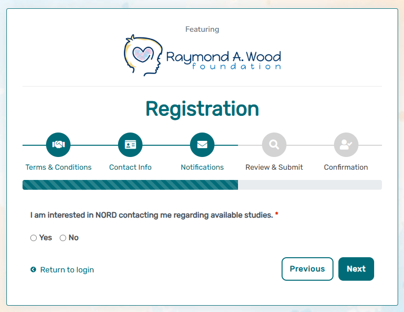 Step 3: Select whether you are interested in being contacted by NORD regarding available studies. When you are finished with this page, click “Next”.